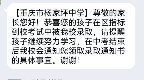 九龙坡指标到校录取,杨家坪中学已经发短信通知了