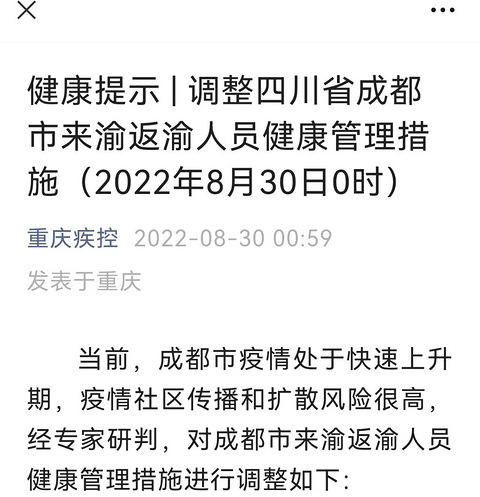 【轻易别去成都!成都来渝严管!重庆调整成都来渝返渝人员健康管理措施】调整理由:当前成都疫情处于上升期,存在较大社区传播和扩散风险!调整时间:8月30日0时起调整内容:1:离渝人员:提醒市民近期不要轻易前往成都及四川其它疫情重点地区;2:来渝返渝:分三类管理:A:近7日内从成都高、中风险来渝返渝人员进行7天集中隔离;B:近7日内从成都除高、中风险区外其它地区来渝返渝人员实行3天居家隔离,并进行3天2