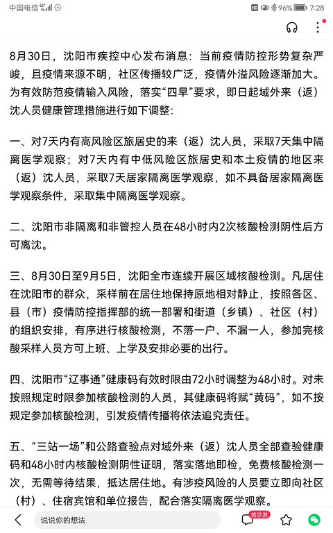 这疫情防控招式,够狠!重庆可以借鉴!绿码有效期只有48小时,否则立马变黄!低风险外来人员也必须居家隔离7天!外出人员非隔离和非管控人员也需48小时内2次核酸检测阴性才能离开!在疫情防控上堪称中国最严!以上是8月30日沈阳疾控中心发布的消息。对比下各自所在区域的疫情防控方式,是不是没有那么大的抵触情绪了,确实面对疫情防控的严峻形势,面对工作、学习、生活上的压力,大家有时候难免心理有些浮躁,但想想看,