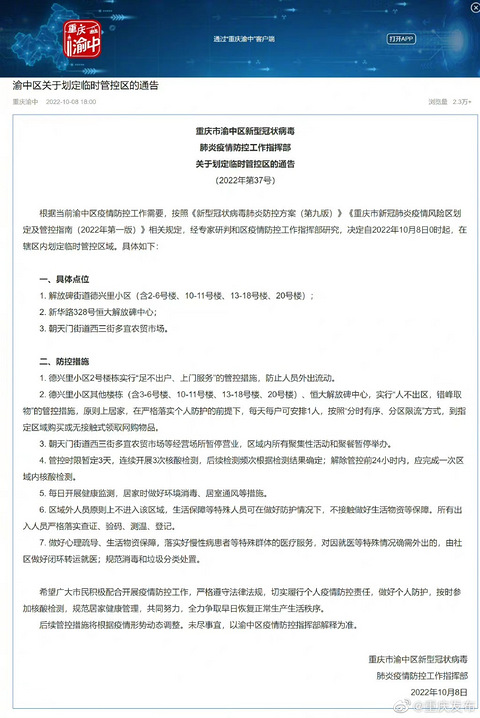 10月8日,重庆市渝中区新型冠状病毒肺炎疫情防控工作指挥部发布关于划定临时管控区的通告(2022年第37号),具体如下↓↓↓