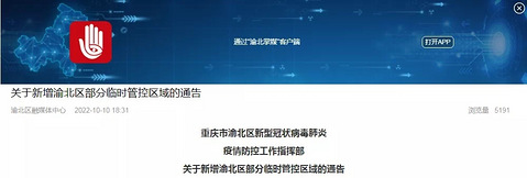 10月10日,重庆市渝北区新型冠状病毒肺炎疫情防控工作指挥部发布关于新增渝北区部分临时管控区域的通告、关于解除渝北区临时管控区域的通告。 按照《新型冠状病毒肺炎防控方案(第九版)》相关规定,结合当前渝北区疫情防控工作需要,经市、区专家研判和渝北区新型冠状病毒肺炎疫情防控工作指挥部研究,决定自2022年10月10日起,渝北区新增部分临时管控区域。现就有关事项通告如下: 一、临时管控区域 仙桃街道空港