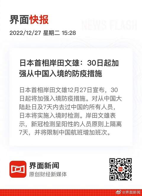 共同社12月27日消息,日本首相岸田文雄27日宣布,30日起将加强入境防疫措施。对从中国大陆赴日及7天内去过中国的所有人员,日本将实施入境时检测。岸田文雄表示,新冠检测呈阳性的人员原则上隔离7天,并将限制中国航班增加班次。