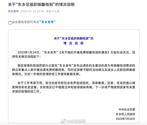 据东乡发布官微消息,2023年1月24日,“东乡发布”《关于组织开展免费核酸检测的通告》引起社会关注。现将有关情况说明如下: 东乡区疫情防控指挥部办公室在“东乡发布”发布此通告的主要目的是为有核酸检测需求的群众和重点人群开展自愿免费核酸检测,同时监测春节期间当地群众及返乡人员新冠病毒感染情况,为进一步做好疫情防控工作提供数据支撑。 由于工作考虑不周,给当地居民和社会各界造成困扰,深表歉意。区委、区