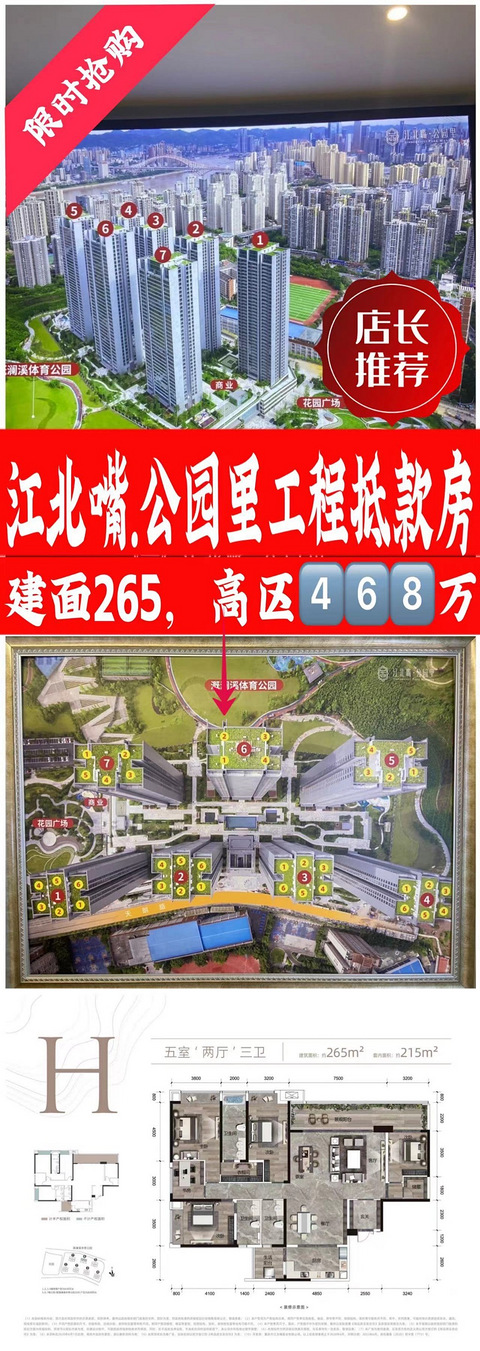 江北嘴公园里工程抵款房楼王6号楼高区看公园建面265㎡,特价468万(诚意要价格可谈)
