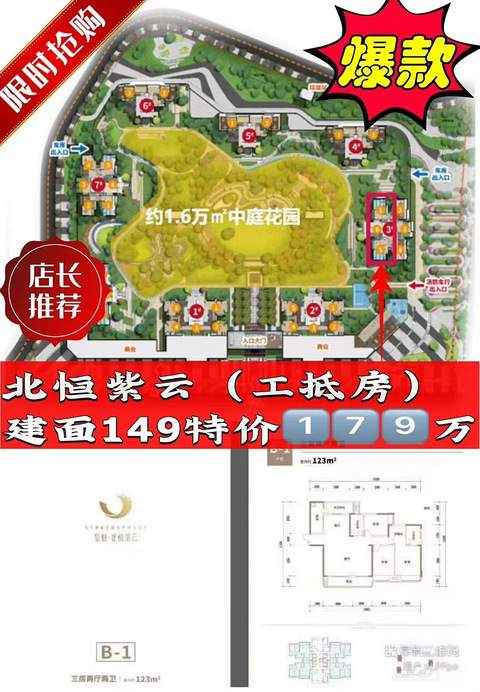 礼嘉.北恒紫云一手工程抵款房礼嘉实验小学两江巴蜀中学——建面149㎡,套内123㎡19楼,朝中庭原价245万,按揭一口价:179万——建面240㎡,套内197㎡原价378万,按揭特价:288万3楼、4楼