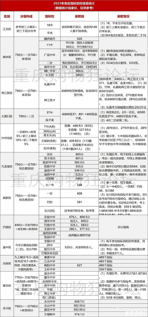 收藏,2023年重庆各区指标到校学校、分数、人数情况统计