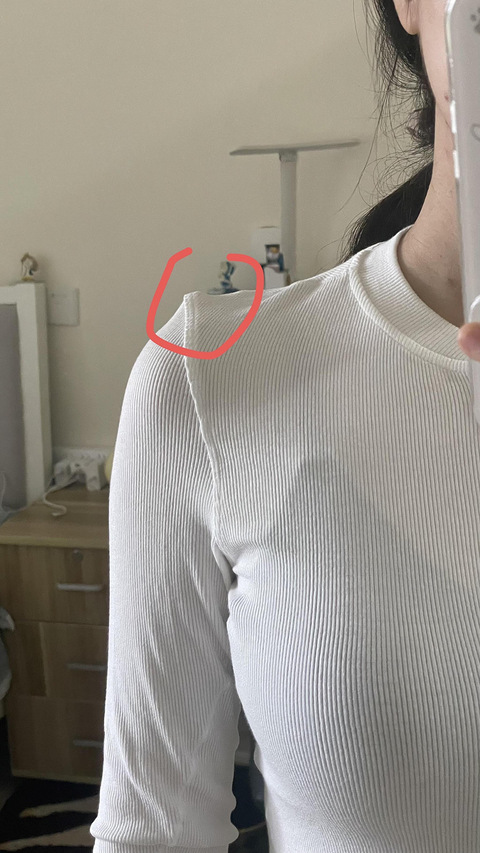 女装退货率高是有原因的如图,200块的打底衫就这版型,肩膀两边翘起来的是牛魔王的角的吗?有时候商家也别怪退货率高,把版型先做好了再说吧……
