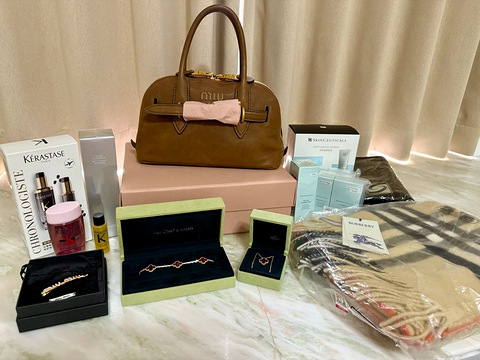 去三亚度假当然少不了去逛免税店,分别住了文华和艾迪逊两个酒店,艾迪逊离cdf非常近,去逛了两次,除了围巾是在机场买的,其余都在三亚cdf购入,没有比较什么价格,就大件叠加了消费券。 1.miumiu贝壳包小号橡木色 27600 粉色发夹 2550 叠加30000-2400的券 返1267积分2.梵克雅宝红五花手链 37400 红中花项链 22700 叠加50000-400消费券 返673积分3.卡