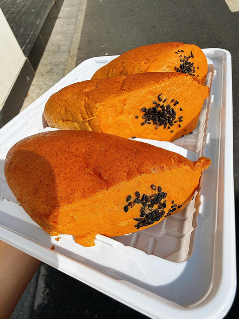 表面是香香甜甜的红薯泥贼丝滑!面包体是全麦的 但吃起来很软乎不干巴中间还有红薯泥夹心 碳水+碳水的快乐谁懂!