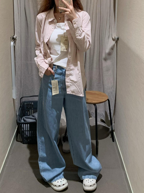 无印良品你是懂做裤子的~这条牛仔裤是阔腿的版型颜色是淡淡的蓝 很遮胯 显得腿也很细试衣间随手拍都很好看闭眼入不踩雷!