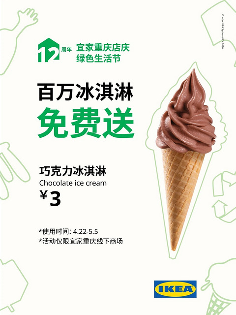 宜家12周年店庆×绿色生活节【第一波:百万巧克力冰淇淋免费领】领取时间:4.7-4.21使用时间:4.22-5.5领取路径:打开APP 右下角“我的” 探索宜家商场 选择【重庆商场】 商场最新动态 点第一条Banner图领取!到店先冲收银线外小餐馆领!