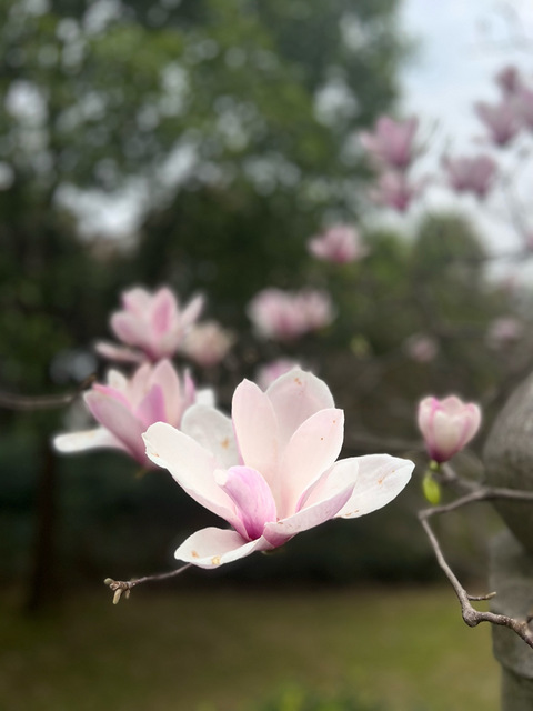 鹅公岩大桥北桥头与南北大道交界处,大片梅花和玉兰花盛开,十分壮观美丽。今天也许天气不好,居然不见打卡人。
