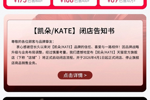 如果你的化妆包里永远少不了一块 KATE 三色眉粉,最近这条消息恐怕会让你心里咯噔一下:近日,【凯朵/KATE】正式发布了闭店告知书,宣布其官方旗舰店将于 2026 年 4 月 1 日正式停止销售。 这个曾伴随无数女孩开启美妆初体验的日系开架彩妆鼻祖,竟然也要在繁华的电商主战场转身离场了,确实让人唏嘘。 KATE 这次要关掉的是由走一般贸易的「官方店」,而主打日本原装、走跨境直邮的「海外旗舰店」目