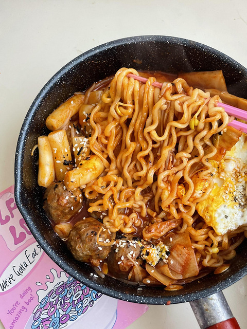 盒马这个韩式泡菜拉面炒年糕有没有人吃过的!!我觉得真的好好吃 自己再加点菜就是一人食部队锅了里面有辣炒年糕酱 空心年糕,泡菜包,鱼饼,鹌鹑蛋和一块面饼。我又加了豆芽 金针菇 牛肉丸和煎蛋,出锅前再盖上一篇芝士,浓郁的奶香味会让辣酱没有那么刺激,辣酱是有点辣的那种,怕辣可以多加一点水或者少倒一些酱,整体非常还原店里的味道真的性价比很高