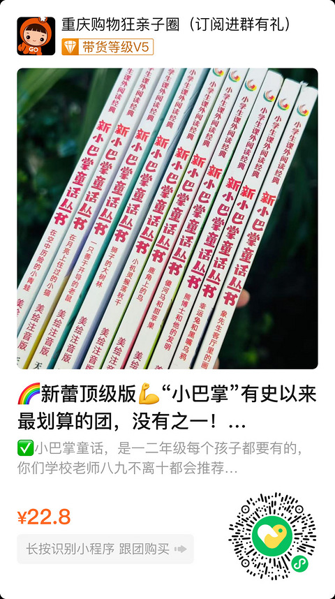 新蕾顶级版小巴掌”有史以来最划算的团,没有之一!!全套厚厚十大本,这画风绝对会被惊艳到,真的是绘本级别!内容简直是一绝,多篇童话入选小学语文教材,荣获全国大奖全彩带注音,网上都是百来块钱贵的吓人,咱们今天直接到手22.83-8岁的孩子你就闭眼入吧,绝对不踩坑