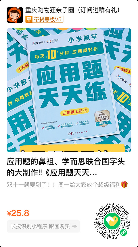 应用题的鼻祖、学而思联合国字头的大制作 《应用题天天练》“11.11”限时福利价——内含大SSS级精讲视频按时按量精准提升新课标教委会推荐(课本教材制作官)随时可能下架!!!小学孩子闭眼囤,价格不等人