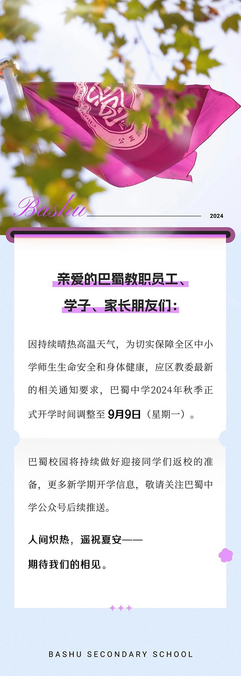 重庆市巴蜀中学校关于2024年秋季学期延迟开学的通知