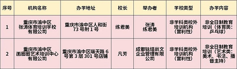 根据《中华人民共和国民办教育促进法》,按照教育部等十三部门《关于规范面向中小学生的非学科类校外培训的意见》(教监管〔2022〕4号)《重庆市非学科类校外培训机构审批流程(试行)》(渝教民发〔2023〕2号)《重庆市非学科类校外培训机构设置标准和管理指南(试行)》(渝教民发〔2023〕3号)文件要求,渝中区教委联合相关部门对拟设立的非学科类校外培训机构进行了材料审核、实地踏勘、综合评估,现对拟同意设