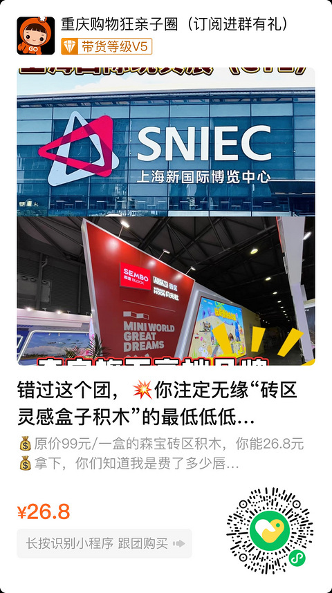 错过这个团,你注定无缘“砖区灵感盒子积木”的最低低低价。。(森宝旗下高端品牌) 库存太稀缺了,清完就断货——是说这个价格26.8元/盒,后面没了(这个原价99元的)本次上海玩具展(CTE)可能也极有可能是最大的一波捡漏!!积木直降70元