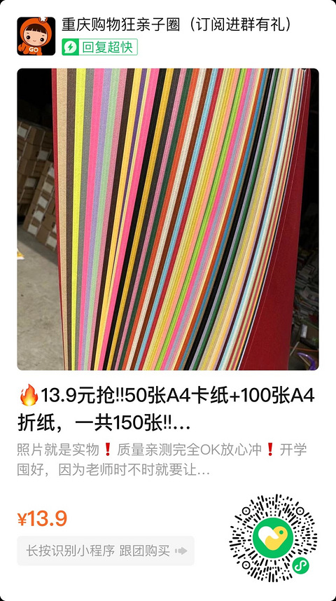 13.9元得50张A4卡纸+100张A4折纸,一共150张开学囤好,因为老师时不时就要让孩子带的不要临时急需又去文具店买三五块钱一张的,真的死贵