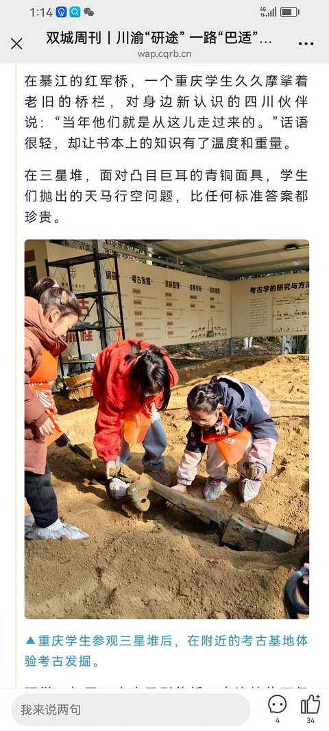 耍娃儿的三星堆亲子考古团被重庆日报整版报道啦 这一年时间的时间,我们跨越川渝 带着亲子家庭深度了解灿烂的古巴蜀文明,在探索与实践中学习历史文化,锻炼动手能力。