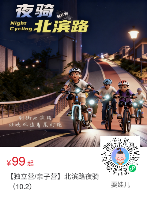 夜骑北滨路,挑战黑夜,欣赏夜景,与星空一路前行(已结束) 作业、考试、补习班 工作、带娃、升学生活中处处充满了压力 我们需要一次身心上的放松... 夜骑释压一起来享受自由飞驰的快感吧~