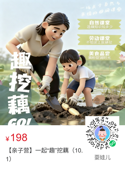 一起去农场挖藕呀!先听“藕”趣小课堂,再变身挖藕小能手接着“藕”遇创意手工坊最后尝尝藕粉的甜蜜时光~还能带着自己的劳动成果回家哟!别犹豫啦,一起开启这趣味满满的藕趣之旅吧!