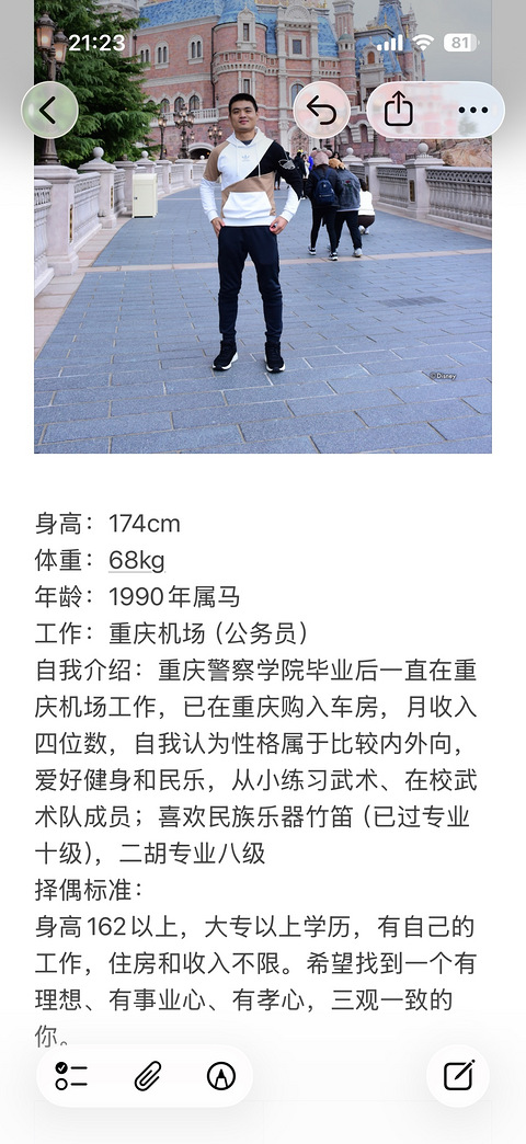 34岁 | 165cm | 重庆定居未婚职业:灵活接单的外卖配送者,月入稳定1w+,时间自由可控经济:有三套住房无贷,没有买房房贷压力,懂得规划未来生活:健身爱好者,空余时间锻炼身体;热爱旅行,每年出门看世界家庭:独子,父母已退休有保障,家庭和睦无负担 希望你在重庆及周边,年龄相仿,性格温和,愿意一起踏实经营生活尊重彼此爱好,能分享宅家看剧的悠闲,也能结伴探索山城的烟火气三餐四季相伴,周末爬山逛