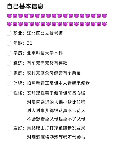 94年 未婚未育 身高163 无车无房无存款 住龙头寺老家周边乡下 工作收银员 养了一只法斗父母普通好相处 有一弟弟 读研希望另一半:在重庆主城生活工作,年龄比我大,有礼貌,有主见,遇事能够及时沟通,能及时表达自己想法,能够接受宠物