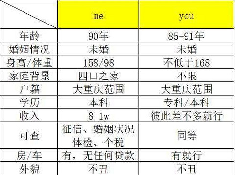 1992年,女,身高1.72。国企校招,从事招标。重庆主城区土著。父母均国企退休。希望对方:家境相当,年纪差4岁以内,工作稳定,身心健康,父母有保障,无负担。