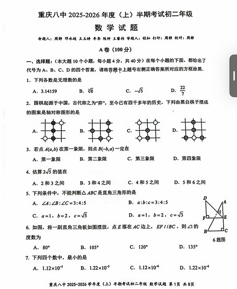八中初二半期数学卷子,来看看难度