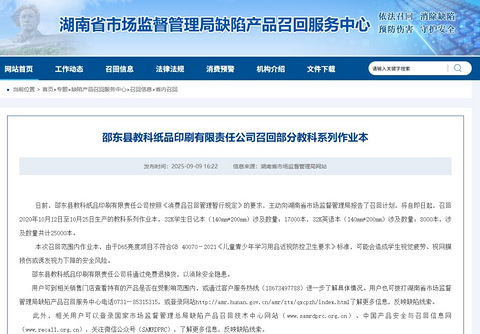 近日,有媒体报道称,市面上一些学生簿册的D65亮度、D65荧光亮度不达标,“防近视”作业本成了“伤眼”本后,湖南省两家涉事企业召回部分教科系列作业本,并免费退换货,涉及数量11万余本。如何为孩子挑选合格的作业本呢?一起来看—— 0111万余本作业本,被紧急召回 据湖南省市场监督管理局网站,邵东县教科纸品印刷有限责任公司按照《消费品召回管理暂行规定》的要求,主动向湖南省市场监督管理局报告了召回计划: