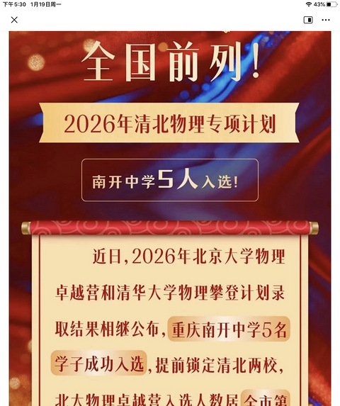 全国前列!全市唯一。南开5人入清北物理专项计划!