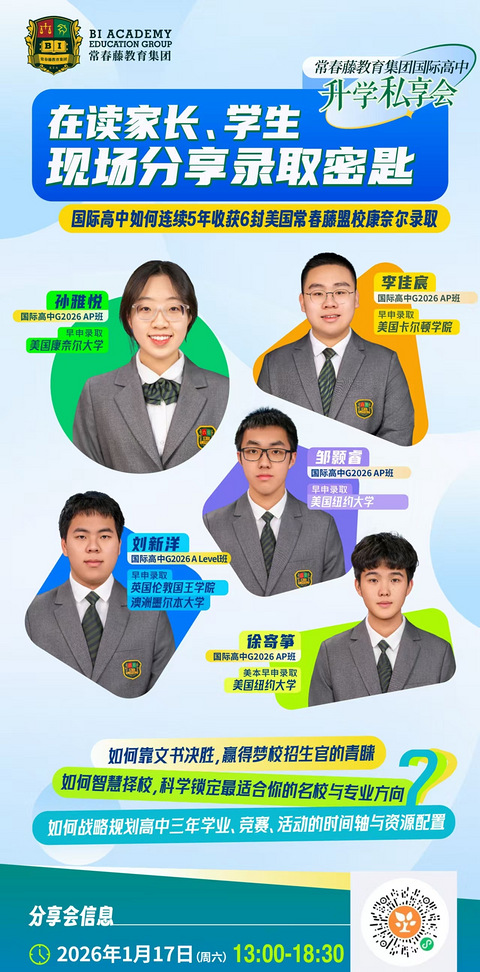常春藤国际高中访校私享会常春藤教育集团国际高中升学私享会在读家长、学生现场分享录取密匙。时间:1月17日(周六) 13:00-18:30。快来点击链接或者扫码报名https://jsj.top/f/iAc6nE