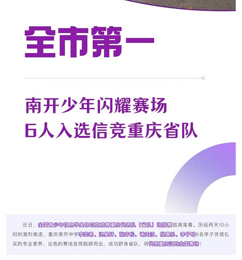 全市第一丨南开少年闪耀赛场,6人入选信竞重庆省队6人初中均来自南渝中学全市总分前五,占三人,全市总分前十,占五人。南渝三年初中生四人次进省队E类!南开系今年取得如此成绩,与南渝、南开6年一贯制培养密切相关。