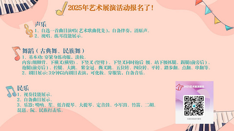 2025年艺术展演活动报名了 声乐1、自选一首曲目演唱(艺术歌曲优先),自备伴奏,消原声。2、视唱、练耳技能展示。 舞蹈(古典舞、民族舞)1.基本功:穿紧身练功服,淡妆。内容:绷脚背、下横叉(横劈)、下竖叉(竖劈)、下竖叉同时抱后 腰、站下腰抓腿、踢腿(前旁后)、抱腿(前旁后)、控腿、大跳、紫金冠、撕叉跳、五位转、四位转、平转、踏步翻、点翻、串翻等。2、剧目展示:3分钟以内剧目表演,可化妆、穿服装