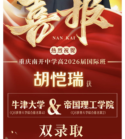南开国际课程中心学子胡恺瑞获牛津、帝国理工双录取。之前从26级20班物竞转到国际部去的!
