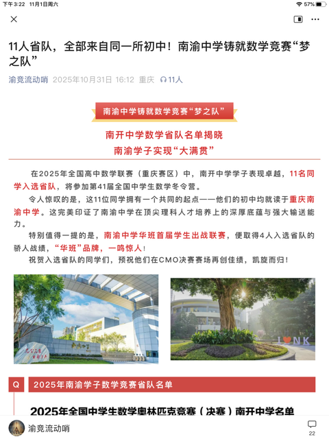 在2025年全国高中数学联赛(重庆赛区)中,南开中学学子表现卓越,11名同学入选省队,将参加第41届全国中学生数学冬令营。令人惊叹的是,这11位同学拥有一个共同的起点——他们的初中均就读于重庆南渝中学。这完美印证了南渝中学在顶尖理科人才培养上的深厚底蕴与强大输送能力。特别值得一提的是,南渝中学华班首届学生出战联赛,便取得4人入选省队的骄人战绩,“华班”品牌,一鸣惊人!祝贺入选省队的同学们,预祝他们