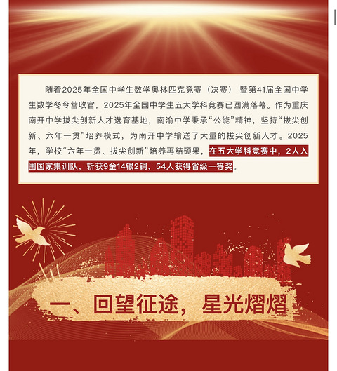 随着2025年全国中学生数学奥林匹克竞赛(决赛) 暨第41届全国中学生数学冬令营收官,2025年全国中学生五大学科竞赛已圆满落幕。作为重庆南开中学拔尖创新人才选育基地,南渝中学秉承“公能”精神,坚持“拔尖创新、六年一贯”培养模式,为南开中学输送了大量的拔尖创新人才。2025年,学校“六年一贯、拔尖创新”培养再结硕果,在五大学科竞赛中,2人入围国家集训队,斩获9金14银2铜,54人获得省级一等奖。