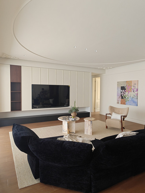 谁懂啊!每天最舒服的时刻,就是窝在客厅看窗外云卷云舒~奶油石膏线+复古吊灯,法式的浪漫DNA动了!黑色皮沙发配奶呼呼地毯,再摆上中古风小推车,高级感直接拉满!