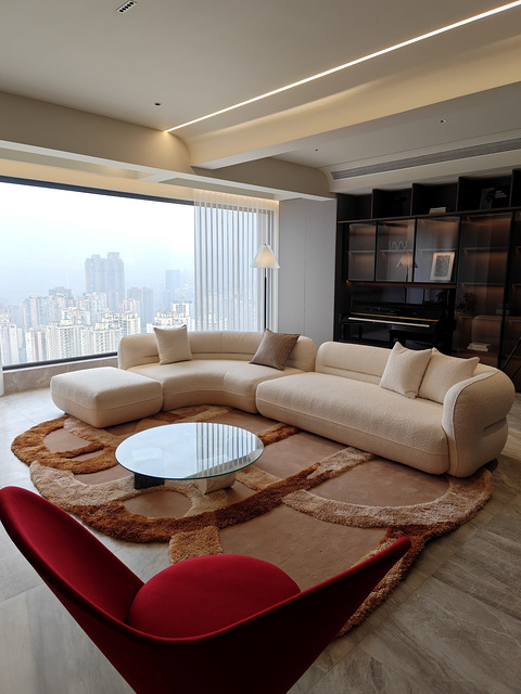 奶油色云朵沙发+大理石茶几,柔软与质感的碰撞!搭配圆形地毯,瞬间拉满温馨感。艺术吊灯是点睛之笔,像云朵般悬浮在空中,阳光透过纱帘洒进来,整个空间都温柔到犯规~