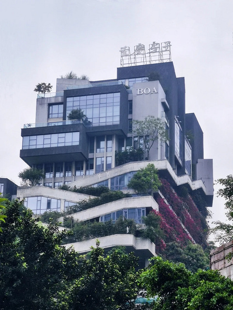 这栋建筑路过看到,真的好漂亮好有特色啊! 搜了一下,它是以重庆吊脚楼为设计起点,择址坡地,依山而建、搭载空中庭院,移动传统与现代碰撞的办公楼,名副其实的山地建筑。2010年开始设计,2014年10月竣工投用。 一栋办公楼吧,很像现在很流行的盒子形商业和写字楼,时间却要早得多。