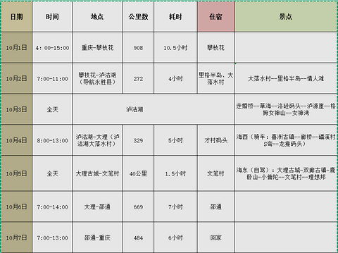 第一次自驾全程一共3000多公里 很悠闲 带娃和老人 未出发前一直很担心娃儿这么长的车程是否坐得住,国庆假期 人多车多堵车 结果一路来都很顺利 不愧是见过彩虹的人 没堵车 娃儿也没哭闹 全程高速 没有走国道是最正确的选择。自驾线路:重庆--攀枝花--泸沽湖--大理--邵通--重庆花费(预算1W剩余900元):住宿:6晚 标间2800 吃饭:3600