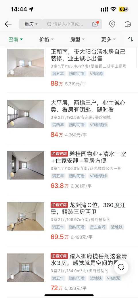现在卖房难,但是不知道有这么难。我巴南的房子栽得深,看了一下周围,龙洲湾洺悦城6000出头,华熙那边挂牌5500,曼哈顿城已经来到4000,蓝光林肯6000出头,阳光100阿尔勒这种纯洋房小区都在8000多,价格即便是龙湖这种开发商,春江天镜也才7000多……最恼火的是,挂牌了一年多都还卖不落! 刚才跟同事讨论了下,他说他们蔡家的房子也差不多,天量挂牌,带看少得惊人,说是都愿意有人喊价就卖。现在蔡